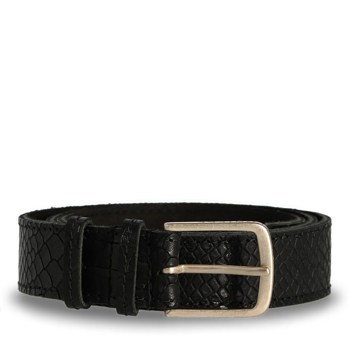 Deze zwarte riem van Fred de la Bretoniere (312010028) transformeert elke outfit om in een on-trend look! Dankzij het geprint leer met croco print en de opvallende gouden gesp krijgt deze riem een echte wow-factor! Draag deze riem in je broek of draag hem juist als tailleriem over een jurkje, het kan allemaal. Combineer je outfit met een bijpassende tas of schoenen en je bent klaar om te stralen! Wij adviseren je om deze riem regelmatig te behandelen met water- en vuilafstotende spray.