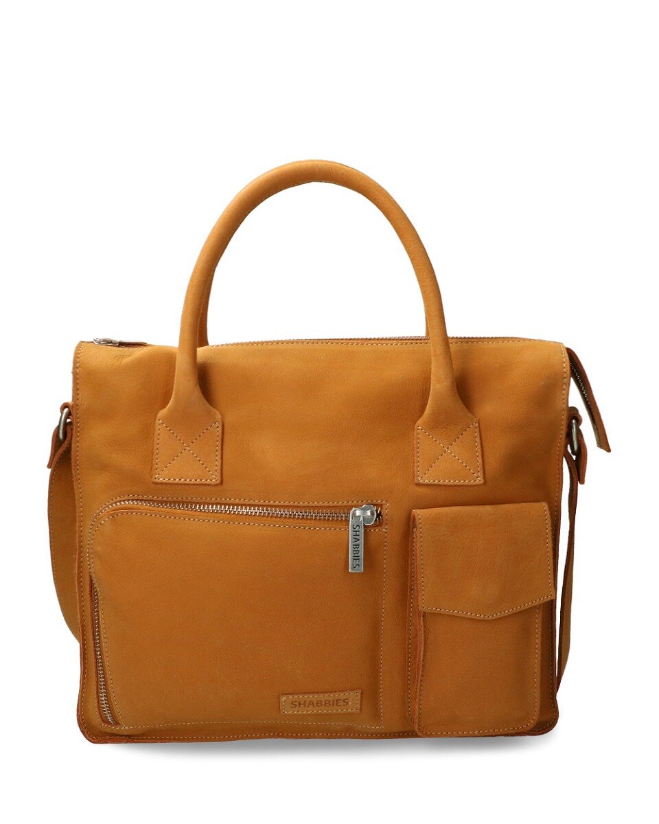 In de collectie van Shabbies Amsterdam vind je deze super handige zakelijke tas (242020011). Het design van de tas is stoer en uniek door de rits aan zowel de bovenkant als aan de voorkant. Naast deze ritssluiting aan de voorkant, vind je ook een ideaal vakje om je sleutels en een bodyspray. Bovendien vind je zowel aan de bovenkant twee hengsels als aan de zijkant van de tas. Deze hengsels zorgen ervoor dat je de tas gemakkelijk om je schouder kan meenemen, maar ook als handtas kan gebruiken. De tas is uitgevoerd in hoogwaardig structuurleer, wat alleen maar mooier wordt naarmate je de tas vaker gat dragen. Wil je weten hoe je deze prachtige tas moet verzorgen? Je kan er alles over lezen op onze blog! Het formaat van deze zakelijke tas is 34X39X9 cm. Wij adviseren je de tas regelmatig te verzorgen met water- en vuilafstotende spray.