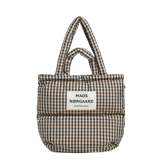 Mads Norgaard Check Club Pillow Black/BeigeDe Check Club Pillow van Mads Norgaard is een stijlvolle, ruime en puffy shopper. Deze gewatteerde shoper heeft korte en lange hengsels. Hierdoor kun je de tas zowel in de hand als over de schouder dragen. De hengels die niet gebruikt worden kunnen naar binnen gevouwen worden. De tas sluit door middel van een drukker aan de bovenzijde van de tas. Aan de binnenzijde van Check Club Pillow bevindt zich een groot hoofdcompartiment met één steekvak. Deze quilted bag is gemaakt 100% polyester. De 'Pillow Bag' is momenteel helemaal hot and happening! Specificaties Mads Norgaard Check Club Pillow Black/BeigeAfmeting: H 38 x B 47 x D 7 cmMateriaal: 100% polyesterKleur: Black/BeigeArtikelnummer: 131521-522EAN-nummer: 5704498966835Fabrieksgarantie: 2 jaarKleding- Merk: Mads Norgaard- Maat: H 38 x B 47 x D 7 cm- Kleur: Black/Beige- Soort: Handtas/Schoudertas/Shopper- Keurmerk: Geen- Herkomst: Denemarken
