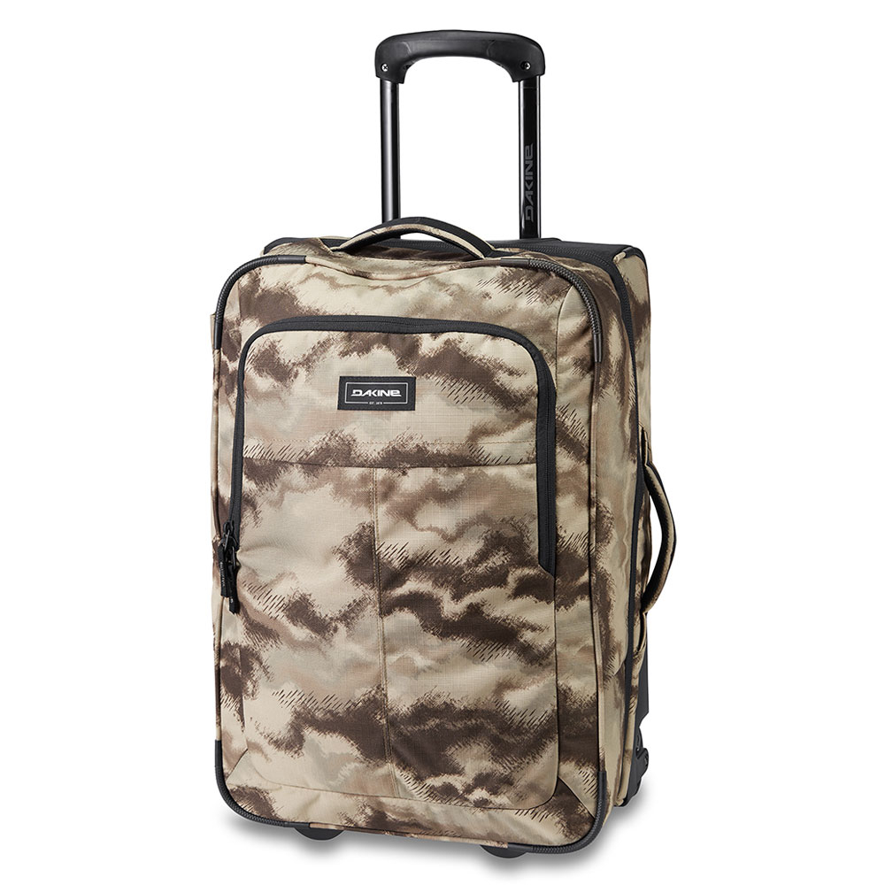 Handbagage trolley van Dakine. Deze trolley heeft 2 binnen compartimenten, waarvan één af te sluiten is doormiddel van een ritssluiting en aan de andere zijde zit een elastiek sluiting. De trolley is zeer gemakkelijk in gebruik met aan de zij- en bovenkant een stevige handgreep, verstelbare trekstang en 2 soepele wielen. De koffer blijft makkelijk staan door de kunststof blokjes aan de voorzijde. Aan de voorkant van de trolley zit een extra ritsvak hierin zit tevens een 17″ laptopsleeve en aan de zijkant zit een ID-tag voor contactgegevens. De trolley is geschikt als handbagage in het vliegtuig.