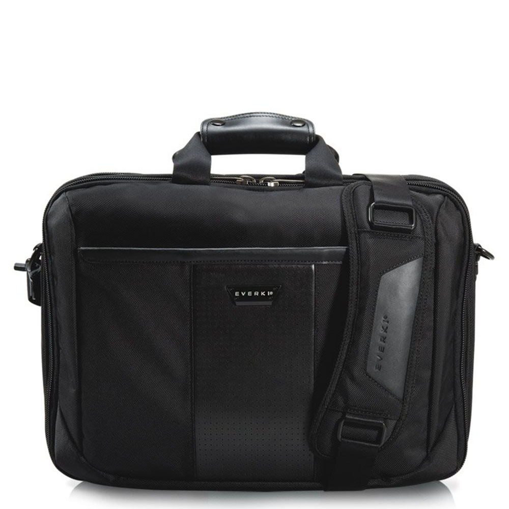 Laptop briefcase uit de Versa serie van Everki. De Versa Premium laptop briefcase is een functionele, georganiseerde en stijlvolle briefcase. Alles komt samen in de Everki Versa laptop briefcase. Oa voorzien van 3 ruime compartimenten, gevoerd 17.3″ laptopvak (41.9×28 cm) welke middels rits volledig te openen is (checkpoint friendly), georganiseerde voorvakken en dubbele (leren) handgrepen met verstelbare, afneembare schouderband. Gemaakt van het stevige waterafstotende ballistic nylon met leren details