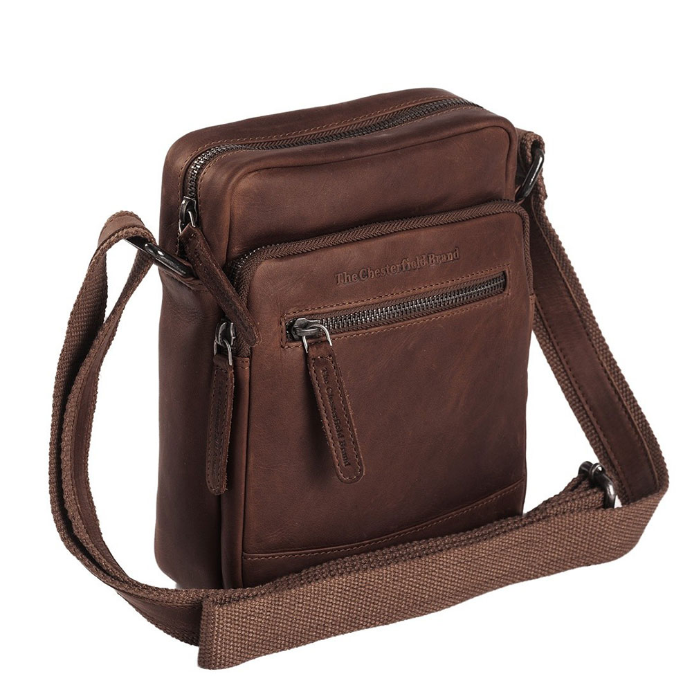 Schoudertas uit de Birmingham serie van Chesterfield. De Birmingham serie van Chesterfield is volledig gemaakt van 100% Pull Up Cow leer. De speciale wax behandeling geeft het leer een uniek effect en is gemakkelijk schoon te vegen. De cross over schoudertas heeft een compact formaat, ritssluiting en intern rits-en steekvakje. Met 2 extra vakjes voorop en achter een klein ritsvakje.